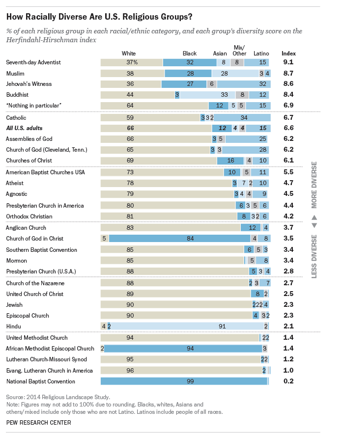 Seventh-day Adventists top the list with a score of 9.1: 37% of adults who identify as Seventh-day Adventists are white, while 32% are black, 15% are Hispanic, 8% are Asian and another 8% are another race or mixed race.