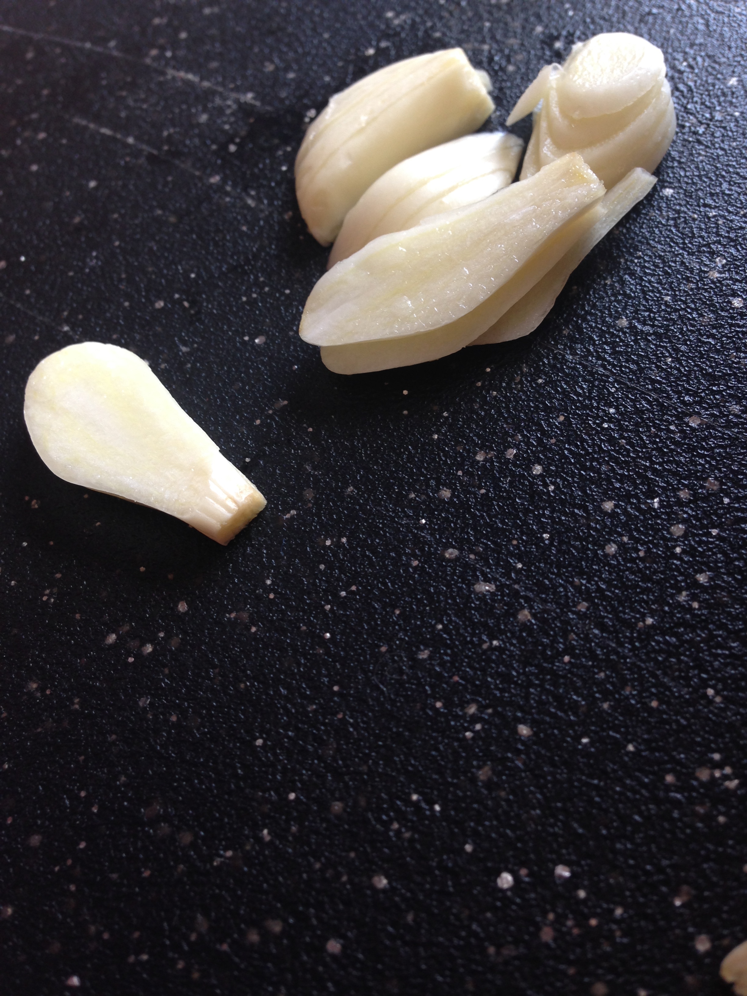 While the asparagus is boiling slice your radishes and garlic into thin, even slices and set aside.
